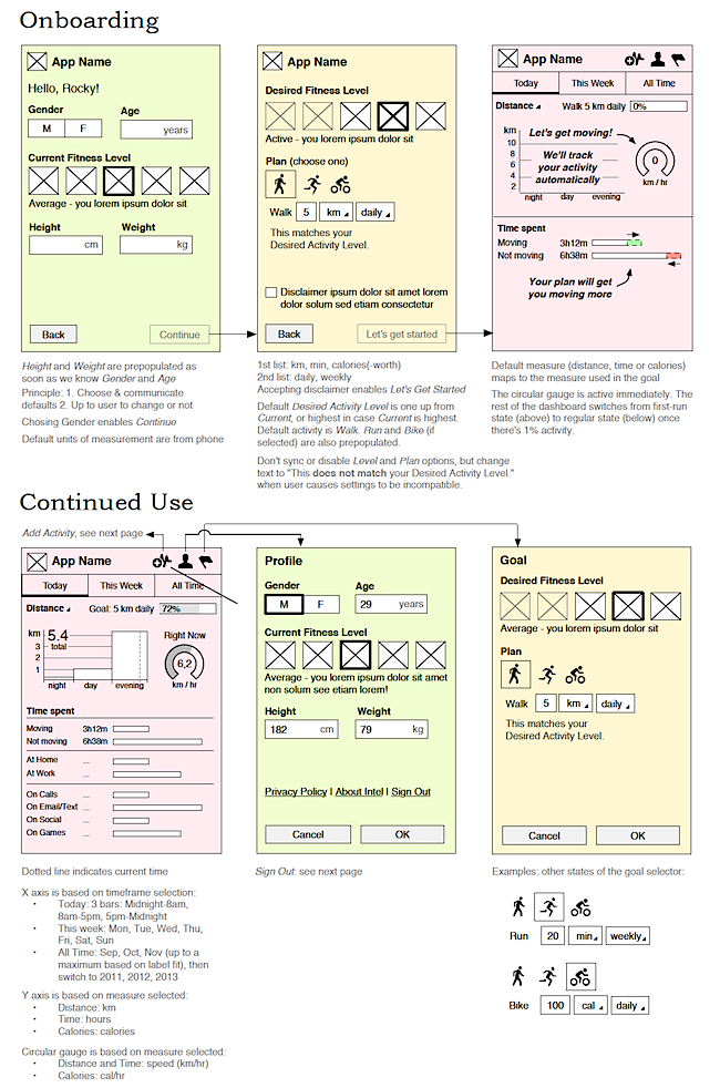 Intel wanted to showcase the capabilities of its new phone chipset & mobile services at an international conference by way of a sample Android health & fitness app. Working with Intel's biz and dev teams, I created this annotated interaction design in 3 days. (Note: If this had been for more than a technical proof-of-concept, I would have included validation with users.)