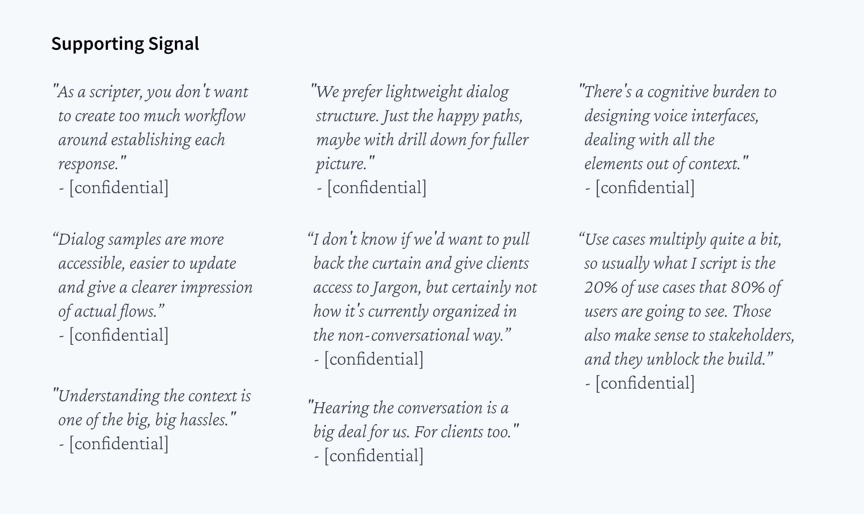 I interviewed conversational design teams about their process and struggles, which showed an opportunity for better supporting the design/development workflow.