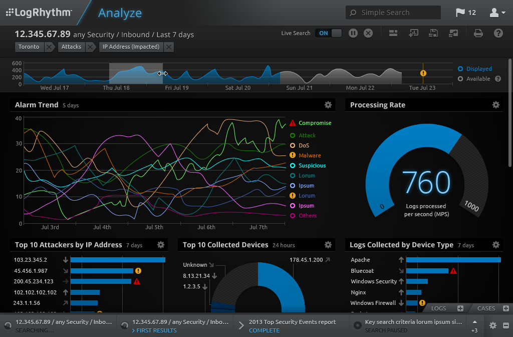When the system detects a threat, the user starts an investigation into the cause and impact. This often involves advanced searches through hundreds of thousands of log events across dozens of systems.