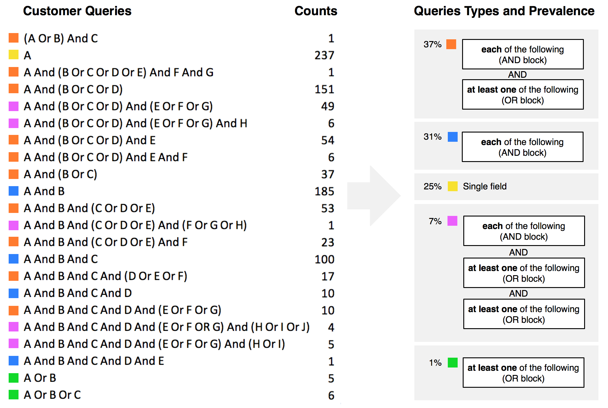 Second, to address the concerns around supporting power users and their scenarios, I requested data logs of actual queries run by their customers. I broke those down into query types and was able to show that the design would be able to handle them all.
